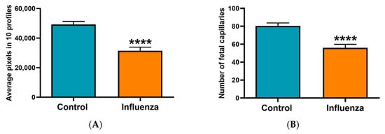 Statistical analysis of the number of fetuses per litter, fetal and placental weights, RT-qPCR data, fetal vascular lumen area and fetal capillary segments in placenta was performed in GraphPad Prism 8. The data were checked for normality using Shapiro–Wilks test. Unpaired, two-tailed Student’s t-tests were used to compare the fetal and placental weights, 2−ΔCt values of target genes in fetal thymus for control and influenza inoculated litters. Differences between influenza-inoculated vs. controls were considered significant when p < 0.05. Data are presented as the mean ± standard error of the mean (SEM). The data were evaluated for normality and compared using the unpaired t-test (GraphPad8 GraphPad Software, San Diego, CA, USA). Correlation between E7.5 fetal and placental weights and fetal sex was analyzed using two-way analysis of variance (ANOVA, GraphPad8).