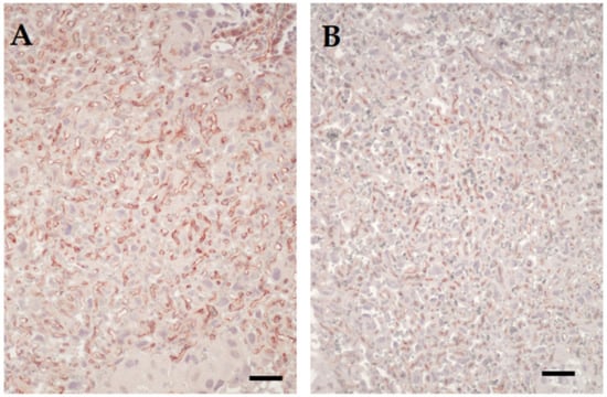 Immunohistochemical labelling of CD34 in the labyrinth of placenta. (A) Microphotograph of labyrinth in placenta from mock-inoculated control mouse. Fetal vessels are seen as irregular spaces lined by reddish-brown stained endothelial. Immunohistochemical labelling of CD34. Original magnification 200×. (B) Microphotograph of labyrinth in placenta from mouse infected on day 7.5 of pregnancy. Note reduced fetal vasculature as reflected by fewer vascular channels per area and smaller volume of individual vascular segments. Scale bars = 40 µm. Original magnification 200×.