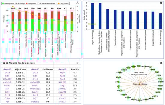 Ingenuity Pathway Analysis (IPA) analysis of genes differentially expressed 1.5-fold or greater in the E7.5 influenza-inoculated fetal thymuses compared to controls collected on day E18.5. (A) Top 10 canonical pathways, total number of genes in each pathway, percent of these genes downregulated and upregulated, and the −log(p-value). (B) Top 10 significant diseases and functions: physiological system: development and function pathways in E7.5 influenza inoculated compared to control fetuses collected on day E18.5. (C) The top 10 analysis-ready molecules based on p value and greatest downregulated and upregulated genes. (D) Disease and Function analysis identified 26 downregulated fetal thymic genes that were associated with respiratory failure in influenza inoculated compared to control fetal thymus. Also see Supplementary Figure S1 describing 1 upregulated and 40 downregulated fetal thymic genes in influenza inoculated thymuses associated with decreased body size and increased risk of neonatal death.