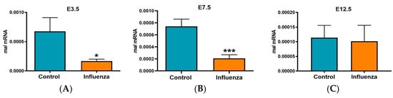 In the RNA-seq data from E7.5 influenza-inoculation fetal thymuses, Mal, a gene related to T cell differentiation/maturation was found to be significantly downregulated by 10.4-fold (p = 2.46 × 10−25) in influenza-inoculated litters compared to controls. Mal was identified as one of the top 10 most significantly differentially expressed genes in influenza-treated fetal thymuses (Figure 4C). Downregulation of Mal was confirmed by RT-qPCR in E3.5 (p = 0.03) and E7.5 influenza-inoculated fetal thymic RNA in Experiment 1 (p < 0.0001) and in Experiment 2 (p = 0.05) but was not different in E12.5 influenza-inoculated fetal thymic RNA (Figure 5). Mal2, a paralog of Mal, was also found to be 9-fold downregulated (p = 1.9 × 10−15) in RNA-seq data from E7.5 influenza-inoculated fetal thymuses compared to controls. By RT-qPCR, Mal2 tended to be decreased in influenza-inoculated fetal thymic RNA in Experiment 1 (p = 0.1) and was decreased in Experiment 2 (p = 0.05) compared to controls.