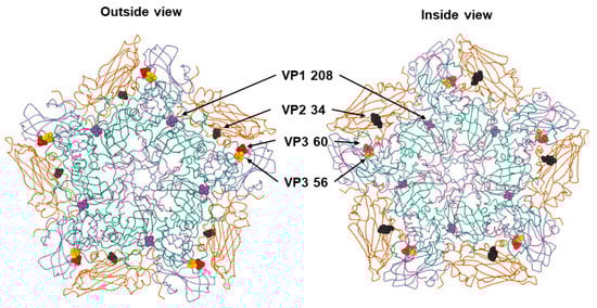 Relative locations of the mutated amino acid residues found in the cell-adapted O/SKR/Andong/2010 virus on the three-dimensional structural model of the foot-and-mouth disease virus (FMDV) serotype O pentamer. The positions of mutated amino acid residues of the cell-adapted virus (L5B6S2), including VP1 208 (purple), VP2 34 (black), VP3 56 (yellow), and VP3 60 (red) are indicated in the outer and inner schematic views of a pentameric subunit (O PanAsia, PDB accession no. 5NE4). The protein subunits of VP1, VP2, VP3, and VP4 are colored cyan, yellow, violet, and pink, respectively.