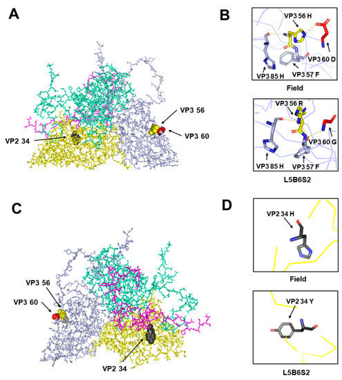 Hydrogen bond analysis of mutated amino acid residues. The locations of mutated amino acid residues, such as VP3 56, VP3 60 (A) (outer view), and VP2 34 (C) (inner view) are designated in the 3D structure of the protomeric subunit of the cell-adapted (L5B6S2) virus. The protein subunits of VP1, VP2, VP3, and VP4 are colored cyan, yellow, violet, and pink, respectively. Hydrogen bonds between the mutated residues, including VP3 56, VP3 60 (B), and VP2 34 (D) and other residues in the protomeric subunit of the field or cell-adapted (L5B6S2) virus were analyzed. The orange dotted lines represent the hydrogen bonds.
