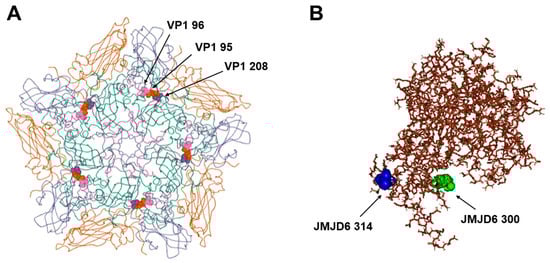 Relative locations of amino acid residues reported in a previous study and this study on the three-dimensional structural model of the FMDV pentamer and the JMJD6 protein. (A) The amino acid residues at positions VP1 95 and 96 [], and VP1 208 (this study) are indicated in the outer schematic view of a pentameric subunit (O PanAsia, PDB accession no. 5NE4). The protein subunits of VP1, VP2, VP3, and VP4 are colored cyan, yellow, violet, and pink, respectively. (B) Amino acid residues 314 [] and 300 (this study) are indicated in the JMJD6 protein.