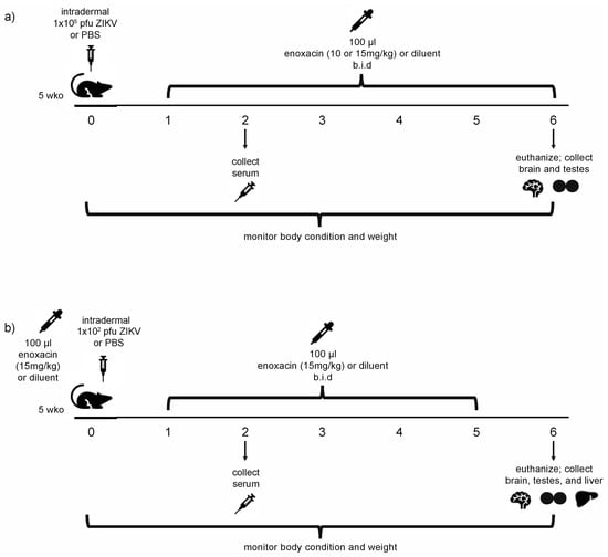 Experimental design. (a) In experiment 1, five-week-old A129 mice were injected with Zika virus (ZIKV) (1 × 105 pfu) or phosphate buffered saline (PBS) then treated orally with enoxacin (10 or 15 mg/kg) or drug diluent twice daily on days 1–6. (b) In experiment 2, five-week-old A129 mice were pre-treated with enoxacin (15 mg/kg) or diluent 8 h before injection with ZIKV (1 × 102 pfu) or PBS and then were treated orally with enoxacin (15 mg/kg) or diluent twice daily on days 1–5 p.i.