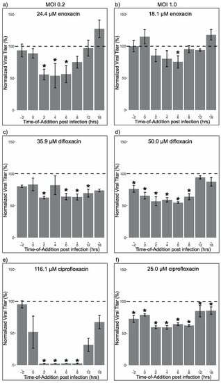 Three sets of time-of-addition assays were used to discern the viral life stage(s) inhibited by each of the three fluoroquinolones. First, monolayers of HEK-293 cells were infected at MOI 0.2 and treated with each of the three drugs at the EC50 value determined using MOI: 0.2. Next monolayers of HEK-293 cells were infected at MOI 1.0 and treated with each of the three drugs at the EC50 value determined using MOI: 1.0. In this second set of assays, ciprofloxacin suppressed virus replication below the level of detection and difloxacin had little effect (Figure S3), so these assays were run again with ciprofloxacin at half its EC50 and difloxacin at twice its EC50.