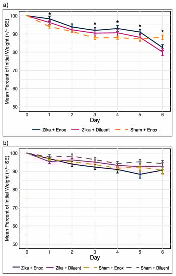 Mouse weight loss did not differ among treatments. (a) Daily percentage of initial weight for experiment 1 was the same for ZIKV infected mice treated with enoxacin (10 mg/kg and 15 mg/kg combined) or diluent and uninfected mice treated with enoxacin (10 mg/kg and 15 mg/kg combined) until day 6 p.i. when the infected mice, regardless of treatment, lost significantly more weight than the uninfected controls. (b) Percentage of initial weight for experiment 2 was not different among treatment groups. * at least one group is different at p < 0.05. Sample sizes in Table 2; full statistics in Table S2.
