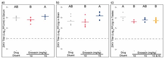 Treatment with enoxacin following high-titer infection suppresses ZIKV replication in mouse testes but not in sera or brain. Individual (dots) and mean (line) ZIKV titers of mice treated with the drug diluent or enoxacin from (a) sera, (b) brain, and (c) testes. Sample sizes for each treatment are listed in Table 2 and statistical analysis is described in the text. Values that do not share a letter are significantly different (p < 0.05).