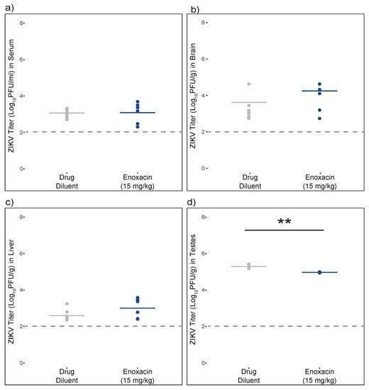 Experiment 1 (Figure 1a): Mice were intradermally injected on day 0 with 1 × 105 pfu ZIKV FSS13025 diluted in 1x PBS (n = 19) or with 1x PBS as a control (n = 11) in a total volume of 100 μL and subsets of infected and uninfected mice were treated with oral enoxacin or drug diluent (3 mM lactic acid) (Table 2) twice daily on days 1–6 p.i. Weight and body condition were recorded twice daily. Two days p.i., 70 μL of blood was collected from the retro-orbital sinus, clarified by centrifugation (5 min at 3380× g), and serum was stored at −80 °C. Six days p.i., mice were euthanized and brain and testes were collected. Each tissue, along with a sterile steel ball, were placed into a 2 mL Eppendorf tube containing 500 μL DMEM supplemented with 2% FBS and penicillin/streptomycin and homogenized in a Qiagen TissueLyser II shaking at 26 pulses/second for 5 min. Homogenates were clarified by centrifugation at 3380 × g for 5 min and stored at −80 °C. Viral titers from serum and tissues were determined in Vero cells in 12 well plates essentially as described above [].