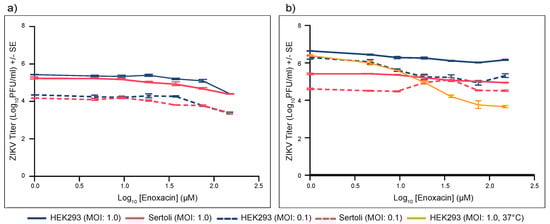 To investigate why the effect of enoxacin on ZIKV infection in mice was limited to the testes, the EC50 of this drug was quantified in both mouse Sertoli cells and HEK-293 cells at each of two MOI: 0.1 and 1.0. As expected, at 32 °C, higher initial MOI generally resulted in higher ZIKV titers, particularly at early timepoints p.i., in both cell lines. Sertoli cells must be cultured at 32 °C, so, for a fair comparison, the potency of enoxacin in HEK-293 cells was re-tested at 32 °C. Moreover, to extend the window for comparison, virus was harvested at both 2 days (Figure 6a) and at 5 days p.i. (Figure 6b).