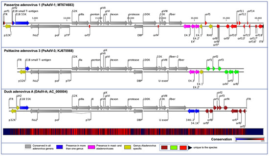 Schematic illustration of the avian atadenoviruses. Schematic map of the passerine adenovirus 1 (PaAdV-1, GenBank accession no. MT674683), in comparison with duck adenovirus A (DAdV-A, GenBank accession no. AC_000004) and psittacine adenovirus 3 (PsAdV-3, GenBank accession no. KJ675568), using CLC Genomic Workbench (version 9.5.4, CLC bio, a QIAGEN Company, Prismet, Aarhus C, Denmark). The arrows symbolize adenovirus genes and open reading frames (ORFs) predicted to code for proteins, indicating their direction of transcription. Each gene or ORF is colour coded, as indicated by the colour key in the legend. The bottom graph represents the sequence conservation between the aligned PaAdV-1, DAdV-A, and PsAdV-3 sequences at a given coordinate at each position in the alignment. The gradient of the colour reflects the conservation of that particular position is in the alignment. Red presents 100% conservation across all three viruses, black 50% conserved regions, and blue less than 50% conserved regions.
