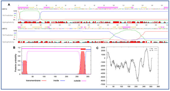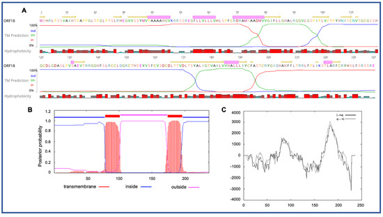 Four novel ORFs (ORF09, -10, -13, and -18) were predicted to contain transmembrane helices (TMHs), but no classical signal peptide. ORF10 was predicted to encode a 312 aa protein (Mw/pI-35.60 kDa/6.35) containing at least two TMHs. The orientation of the protein in the TMHs is shown in Figure 2. Furthermore, the TMHs detected by EMBOSS in Geneious also showed the presence of alpha-helices (α-helices) within TMHs predicted region, which was dominated by highly hydrophobic residues (red colour) (Figure 2A). However, we were unable to model the structure of ORF10 and or TMHs by using the Phyre2, HHpred, and SWISS-MODEL; this might be due to the lack of closely related structure in the database. Though the function of TMHs and dominant hydrophobic residues in this novel ORF is unknown, studies have shown that hydrophobicity drives the insertion of helical segments into the transmembrane proteins and acts as a hallmark of soluble globular protein tertiary structure [44,45]. ORF18 was predicted to encode a 237 aa protein (Mw/pI-26.14 kDa/8.81) that was also predicted to have at least two TMHs (Figure 3). TMHs detected in ORF18 by EMBOSS in Geneious also showed the presence of α-helices within TMHs predicted region, and they were also shown to be dominated by highly hydrophobic residues (red colour) (Figure 3A). Similarly, ORF13 was shown to contain a single TMH by TMHMM, TMpred, and EMBOSS tool in Geneious used in this study (Supplementary Figure S1). The protein encoded by a novel ORF09 (181 aa) was predicted to have at least one C-terminal TMH by several programs, including EMBOSS 6.5.7 tool charge in Geneious, TMHMM and TMpred (Supplementary Figure S2). However, there was an additional N-terminal TMH detected by Geneious and TMpred, and a further TMH was predicted by TMpred (Supplementary Figure S2). Nonetheless, there was no evidence for conserved secondary structure and or protein homologs detected by various software, including HHpred [37], (Phyre2) [38], and SWISS-MODEL [39].