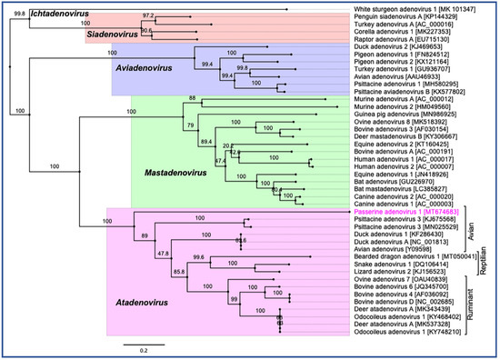 Phylogenetic tree shows the possible evolutionary relationship of novel passerine adenovirus 1 with other selected AdVs. Maximum likelihood (ML) tree was constructed by using concatenated amino acid sequences of the complete DNA-dependent DNA polymerase, pTP, penton, and hexon genes. Concatenated protein sequences were aligned with MAFTT (version 7.450) [41] in Geneious (version 10.2.2, Biomatters, Ltd., Auckland, New Zealand), under the BLOSUM62 scoring matrix and gap open penalty = 1.53. The gap >20 residues deleted from the alignments. The unrooted ML tree was constructed with PhyML [42] under the LG substitution model, and 1000 bootstrap re-samplings were chosen to generate ML trees, using tools available in Geneious (version 10.2.2, Biomatters, Ltd., Auckland, New Zealand). The numbers on the left show bootstrap values as percentages, and the labels at branch tips refer to original AdVs species name, followed by GenBank accession number in parentheses. The final tree is visualised with FigTree (version 1.4.4) [43]. The five official genera are highlighted as different background colours, and novel passerine adenovirus 1 is shown in pink colour.