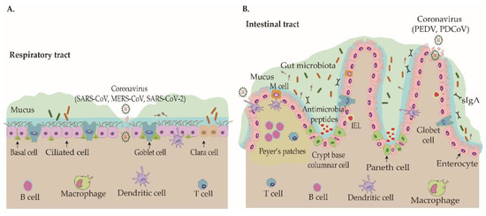 Interferon (IFN) production is a fundamental process involved in the innate immune response to viral infection. These soluble antiviral cytokines can induce upregulation of an array of intracellular effectors of interferon-stimulated genes (ISGs) through the Janus kinase/signal transducer and activator of transcription (JAK/STAT) signal pathways, such as Mx proteins, protein kinase PKR, and ISG15, which have antiviral activity as they halt viral replication and dissemination of infected cells [4]. Thus, before effective adaptive immune responses are initiated, the IFN-mediated innate immune response plays a critically important role in eliminating virus invasion and protecting tissue damage and inflammation at the early phase of infection [5]. However, recent studies revealed that excessive expression of type I and III IFNs might disrupt the repair of lung epithelial tissue during respiratory viral infection [6,7,8]. Indeed, coronaviruses are known to efficiently circumvent the host immune systems, and IFN production can barely be detected during the early phase of coronavirus infection [9,10]. Compared with SARS and MERS, COVID-19 patients have extended incubation periods without apparent symptoms, which subsequently contribute to the cytokine storm, damaging inflammation, and other severe complications [11,12]. On the other hand, coronaviruses might have evolved to escape innate immune responses by their infected hosts [13]. It has to be mentioned that IFN-antagonistic functions affect viral virulence to a considerable extent and might be associated with interspecies transmission of emerging and reemerging viruses [14]. Therefore, in this review, we summarize antiviral immunity in the respiratory and intestinal tracts against coronaviruses that have been reported to cause epidemics in both humans and domestic animals. In particular, we highlight how these different coronaviruses exploit multiple strategies to evade immune surveillance exerted by the host.