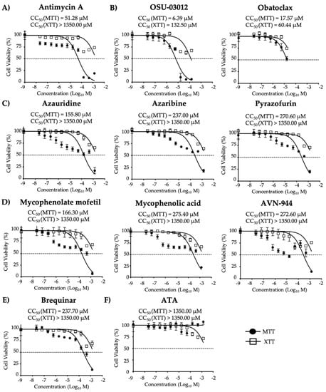 Cytotoxicity of the ten tested compounds: Vero cells (96-well plate format, 5 × 104 cells/well, quadruplicates) were incubated with DMEM 5% FBS containing the indicated doses of the inhibitors (3-fold serial dilutions, starting concentration of 1350 µM) (A) Antimycin A, (B) OSU-03012 and Obatoclax, (C) Azaribine, Azauridine, and Pyrazofurin, (D) Mycophenolate mofetil, Mycophenolic acid, and AVN-944, (E) Brequinar, and (F) Aurintricarboxylic acid (ATA). Cell viability assays (MTT and XTT) were performed at 36 h post-treatment and the CC50 for each compound was calculated. Dotted line indicates the 50% toxicity of each of the compounds. Data were expressed as mean and SD from three independent experiments conducted in quadruplicates.