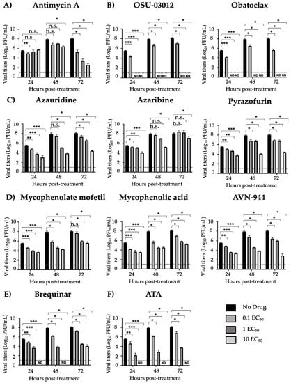 Growth kinetics inhibition of ZIKV Paraiba/2015: Vero cells (24-well plate format, 2.5 × 105 cells/well, triplicates) were infected (MOI 0.1) with Paraiba/2015. After 2 h viral absorption, cells were treated with the indicated concentrations of compounds (0, 0.1, 1, and 10 EC50) (A) Antimycin A, (B) OSU-03012 and Obatoclax, (C) Azaribine, Azauridine, and Pyrazofurin, (D) Mycophenolate mofetil, Mycophenolic acid, and AVN-944, (E) Brequinar, and (F) Aurintricarboxylic acid (ATA); or 0.1% DMSO vehicle control (No drug) in infection media (DMEM 2% FBS). Tissue culture supernatants were collected at 24, 48, and 72 h post-treatment, and viral titers were calculated by immunostaining using the anti-E 4G2 mAb. Dotted line indicates the limit of detection (10 PFU). Data were expressed as mean and SD from three independent experiments conducted in triplicates. Statistical analysis was conducted by an unpaired Student’s t-test, * p < 0.05, ** p < 0.01, *** p < 0.001, or no significance (n.s.).