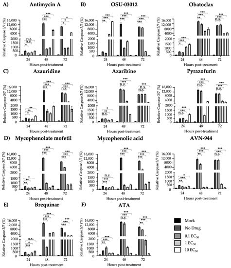 Prevention of apoptosis-induced cell death: Vero cells (24-well plate format, 2.5 × 105 cells/well, triplicates) were infected (MOI 0.1) with Paraiba/2015. After 2 h viral absorption, infected cells were treated with the indicated concentrations of compounds (0, 0.1, 1, and 10 EC50) (A) Antimycin A, (B) OSU-03012 and Obatoclax, (C) Azaribine, Azauridine, and Pyrazofurin, (D) Mycophenolate mofetil, Mycophenolic acid, and AVN-944, (E) Brequinar, and (F) Aurintricarboxylic acid (ATA); and Caspase 3/7 levels were measured at 24, 48, and 72 h post-treatment. Data of each time point was compared to mock-infected control cells and expressed as mean of relative percentage and SD from three independent experiments conducted in triplicates. Statistical analysis was conducted by an unpaired Student’s t-test, * p < 0.05, ** p < 0.01, *** p < 0.001, or no significance (n.s.).