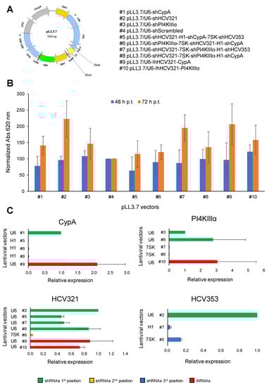 In order to generate novel combinatorial platforms able to interfere with HCV replication, first of all, we consulted previous literature data and online HCV resources to select 4 different shRNAs already known to efficiently block the viral life cycle: the IRES specific HCV353 and HCV321 siRNAs as well as siRNAs targeting the PI4KII and CypA host factors [18,20,32]. Furthermore, a scrambled control was also designed by adopting an ad hoc software tool (https://www.genscript.com/tools/create-scrambled-sequence, accessed 13th October 2018). Expression of the different shRNA cassettes was placed under control of the human U6 small nuclear RNA, H1, and 7SK pol-III promoters. Next, we inserted the pol-III/shRNA cassettes in the context of pLentiLox3.7 (pLL3.7) self-inactivating lentiviral vector [48] that also expresses the EGFP reporter protein (Figure 1A and supplementary Figure S1). The anti-HCV molecules were either cloned as single transcriptional units (U6/shRNA) or as triple cassette arrays, by adopting all the selected pol-III promoters in different combinations, following the same cloning strategy previously described [33]. The U6 promoter was also employed to express lhRNAs. Specifically, two vectors were generated, named pLL3.7/U6-lhHCV321-PI4KIIIα and pLL3.7/U6-lhHCV321-CypA, both bearing two RNAi molecules under the transcriptional control of the U6 promoter. The list of generated vectors is reported in Figure 1A and supplementary Figure S1. Next, pseudotyped recombinant vectors were generated and quantified as previously described [33], and the same amount was employed to transduce the hepatocyte-derived cellular carcinoma cell line Huh7.5 at MOI of 0.062 TU/cell. Transduction efficiency ranged from 30 to 60% for all recombinant lentiviral particles. None of the selected lentiviral vectors showed a significant cytopathic effect on Huh7.5 cells with respect to the scrambled-transduced control (set as 100%), at least at 48 and 72 h post-transduction (p.t.), as shown by the effect of transduction and anti-HCV shRNA expression on cell viability/growth by adopting an MTT assay (Figure 1B).