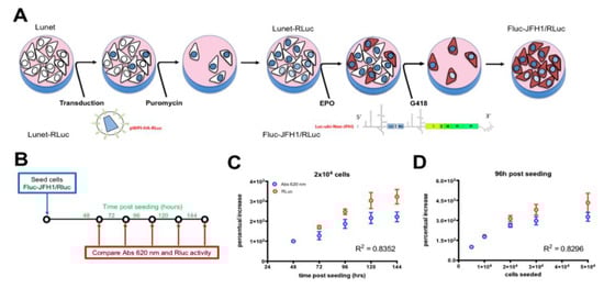 In order to (i) allow easy quantification of the levels of HCV replication in cell culture and (ii) simultaneously normalize for well-to-well variations in cell number linked to variance in cell seeding, as well as effects on cell growth and viability due to drug treatments, transfection, and lentiviral transduction, we developed a new HCV replicon double-reporter cell line (Figure 2A). To this end, we firstly transduced Huh7-Lunet, a subgenomic HCV-cured cell line that allows high levels replication of HCV RNA [40], with bicistronic lentiviral particles mediating the expression of a HA-RLuc fusion protein under the control of the EF1α promoter. Selection with puromycin allowed to select a polyclonal population stably expressing RLuc (Lunet-RLuc). Subsequently, Lunet-RLuc cells were electroporated with in vitro transcripts from plasmid pFKI389Luc-ubi-neo/NS3-3′_dg_JFH, thus introducing a bicistronic subgenomic FLuc-expressing reporter HCV replicon, conferring resistance to G418 upon RNA replication. Prolonged incubation of such cells with G418 resulted in selection of the FLuc-JFH1/RLuc replicon cell line. We tested the utility of this cell line to quantify the cell number by MTT assay and RLuc activity. Different amounts of FLuc-JFH1/RLuc cells were seeded either in 96 (for MTT assays) or 24 (for RLuc assays) well plates and cultured for different times, before being processed as described in the Materials and Methods section for evaluation of cell growth through MTT or RLuc activity assays (Figure 2B). Our results show that the data obtained from MTT and RLuc assays were highly comparable (Supplementary Figure S2). Indeed, the percentual increase of Abs at 620 nm measured by MTT assays well correlated with the percentual increase measured by RLuc assays when the same cell number was monitored for up to 144 h post-seeding (Figure 2C) or when different cell numbers were seeded and analyzed at the same time post-seeding (Figure 2D). This finding implies that the RLuc (cell viability) and FLuc (HCV replication) values can be obtained in a single assay, thus simplifying sample handling, as well as data acquisition and analysis (Figure 2C,D).