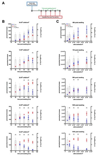 Next, we tested the suitability of such a replicon cell line for quantitatively correlating viral replication and cell growth by measuring the FLuc/RLuc activity. To this end, different amounts of FLuc-JFH1/RLuc cells were seeded in 24-well plates and lysed for quantification of viral replication (FLuc) and cell number (RLuc) at different time points post-seeding (Figure 3A). This allowed us to assess the effect of cell confluency, evaluated by light microscopy, on HCV replication. Our results indicated an inhibition of HCV RNA replication when cells were overconfluent (Figure 3B,C). This was even more evident when the FLuc/RLuc ratio was used as a marker of viral RNA replication normalized for the cell count, and consistent with previously published data [49].