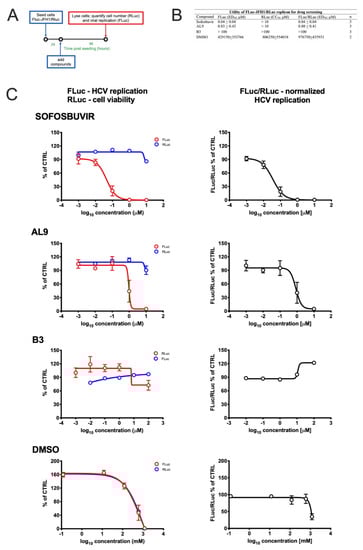To assess the utility of our double replicon cell line as a tool to quantify the inhibition of HCV replication by novel therapeutic interventions, we started by testing the effect of well-known HCV inhibitors in cell culture. To this end, cells were seeded in 24-well plates and, 24 h later, treated with increasing concentrations of either the nucleoside NS5B inhibitor Sofosbuvir [50], or AL-9, an inhibitor of the host cell kinase PI4KIIIα, essential for HCV replication [29]. As controls B3, a compound active agent targeting Human Cytomegalovirus (HCMV; Alvisi et al., unpublished) or DMSO, an agent endowed with cytotoxic properties at high concentrations, were also included (Figure 4A). As expected, both Sofosbuvir and AL-9 inhibited HCV replication with ED50 values comparable to those described in the literature (40 ± 40 and 800 ± 410 nM, respectively), without observable cytotoxic effects (Figure 4B). On the other hand, no effect on HCV replication and cell viability was observed after incubation with the control molecule B3, whereas a strong inhibition of HCV replication was observed upon treatment with high concentrations of DMSO. However, such inhibition corresponded to a similar decrease in the cell viability/number, indicating a non-specific, cytotoxic-mediated effect. Therefore, the developed FLuc-JFH1/RLuc cell line allowed easy discrimination between specific and unspecific inhibition against HCV replication (Figure 4C). To verify if FLuc activity correlated with HCV replication we assessed the effect of Sofosbuvir on both FLuc activity, by means of luciferase assays, and HCV protein expression, by Western blotting. Our results showed that FLuc activity well correlated with NS5A expression, further confirming the utility of our double reporter cell line (Supplementary Figure S3).