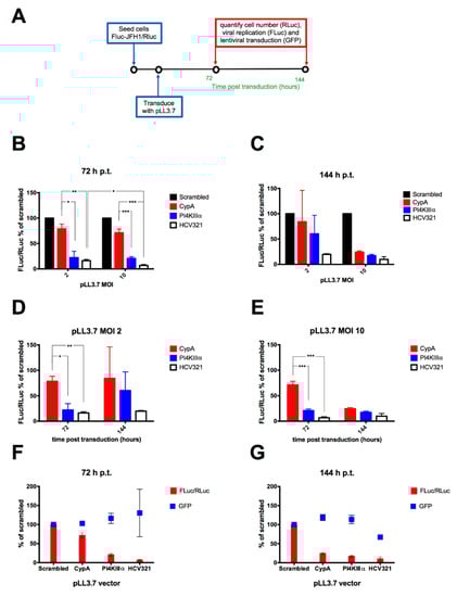 The new cellular model was used to evaluate the effect of lentiviral-mediated shRNA expression on HCV replication using pLL3.7 lentiviral particles encoding for individual anti-HCV shRNAs either targeting the HCV genome (HCV321) or essential host factors, such as PI4KIIIα and CypA. A scrambled control was also included. To this end, cells were seeded in 24-well plates and 24 h later transduced with lentiviral particles at a MOI of 2 and 10 TU/cell, before being processed at 72 and 144 h p.t. for quantification of cell number (RLuc), viral replication (FLuc) and transduction efficiency (GFP), in order to normalize viral replication (FLuc/RLuc) and transduction efficiency (GFP/RLuc) for the cell number (Figure 5A). All tested recombinant lentiviral particles showed antiviral effects and inhibited viral replication with variable efficacy and kinetics (Figure 5B–E). The strongest anti-viral activity was observed after transduction with pLL3.7/U6-shHCV321. For all lentiviral vectors tested, transduction at a MOI of 10 TU/cell resulted in a stronger antiviral effect (Figure 5B,C). This phenomenon was more evident at 144 h p.t., suggesting a more sustained inhibition of viral replication over time when transducing cells at an higher MOI (Figure 5D,E). Importantly, differences observed in viral replication inhibition did not depend on variability in cell transduction, as assessed by quantification of GFP fluorescence (Figure 5F,G). Statistical analysis indicated that at 72 p.t. cells transduced with pLL3.7/U6-CypA at a MOI of 2 and 10 TU/cell reduced viral replication to a significantly lesser extent than transduction with either pLL3.7/U6-PI4KIIIα (p = 0.0112 and 0.0007, respectively) or pLL3.7/U6-shHCV321 (p = 0.0070 and 0.0002, respectively). However, no statistically significant difference was observed between cells transduced with the different lentiviral particles targeting HCV replication at 144 p.t.