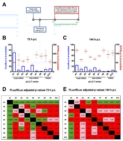 Since inhibition of viral replication with a single shRNA-expressing cassette might promote the selection of resistant escape viral mutants, we tested the ability of 6 combinatorial lentiviral particles simultaneously expressing different shRNAs, to specifically inhibit HCV replication. To this end, the FLuc-JFH1/RLuc replicon cell line was transduced with 10 different lentiviral particles at a MOI of 10 and the effect of viral replication was assessed at 72 and 144 h p.t. (Figure 6A). RLuc (cell number), FLuc (HCV replication) and GFP (transduction efficiency) activities were measured, in order to normalize viral replication (FLuc/RLuc) and transduction efficiency (GFP/RLuc) for the cell number (Figure 6B,C). Statistical analysis indicated that transduction with the 10 different lentiviral particles affected viral replication to a statistically different extent, both a 72 and 144 p.t. (p values < 0.0001 and 0.0012, respectively), in the absence of statistically significant differences in the transduction efficiency. Both at 72 (Figure 6B) and 144 h p.t. (Figure 6C), the combinatorial vectors showed inhibitory effects comparable or higher to those achieved by the single shRNA-expressing lentiviral vectors. Importantly, lentiviral vector #1 (pLL3.7/U6-shCypA) resulted in the lowest inhibition of HCV replication, followed by vectors #3 (pLL3.7/U6-shPI4KIIIα) and #6 (pLL3.7/U6-shPI4KIIIα-7SK-shHCV321-H1-shCypA). Overall, the strongest inhibition was observed 144 h p.t. after transduction with lentiviral vector #8 (pLL3.7/U6-shHCV321-7SK-shPI4KIIIα-H1-shCypA). Importantly, the differences observed in viral replication inhibition did not depend on the variability in cell transduction, as assessed by quantification of GFP fluorescence after normalization for the cell number using the RLuc activity (Figure 6B,C; red bars). Post-test ANOVA analysis of the effect of transduction with the different lentiviral particles revealed that at 72 h p.t., vector #1 was significantly less active than all other vectors (Figure 6D). In addition, vectors #2 (pLL3.7/U6-shHCV321), #5 (pLL3.7/U6-shHCV321-H1-shCyp-7SK-shHCV353), #7 (pLL3.7/U6-shHCV321-7SK-shPI4KIIIα-H1-shHCV353) and #8 (pLL3.7/U6-shHCV321-7SK-shPI4KIIIα-H1-shHCV353) significantly inhibited viral replication also more than vector #6, while only vector #8 significantly inhibited viral replication more than vector #3 (pLL3.7/U6-shPI4KIIIα) (see Figure 6D for adjusted p values). At 144 h p.t., however, only transduction with combinatorial vectors inhibited viral replication to significantly higher levels as compared to vector #1, with vector #8 also almost reaching significance (p = 0.054) as compared to vector #3 (see Figure 6E for adjusted p values). These data suggest that lentiviral particles expressing shRNAs and lhRNAs with our combinatorial strategy can inhibit HCV replication at least as efficiently as single shRNA expressing vectors.