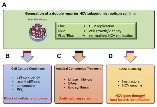Schematic representation of the study experimental set up. (A) We established a double reporter HCV replicon cell line allowing simultaneous luminometric quantification of HCV genotype 2a JFH1 replication (FLuc) and cell proliferation/viability (RLuc). Such cell line can be used for several applications including: testing the effect of cell culture conditions on HCV replication (B), antiviral compounds identification/screening (C), or gene silencing experiments aimed at identifying new host factors, as well as optimization of conditions for therapeutic gene silencing (D).
