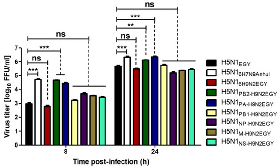 The replication efficiencies of H5N1EGY reassortants were characterized by infection of mammalian MCDK-II cells at a low multiplicity of infection (MOI) = 0.01 at 37 °C for 8 h (single replication cycle) and 24 h (multi-replication cycles). Out of the 7 reassortants, only two H5N1 reassortants, which express the PB2 and PA polymerase subunits of H9N2EGY (H5N1PB2-H9N2EGY and H5N1PA-H9N2EGY) replicated significantly higher than the parent H5N1EGY strain (Figure 2). The replication efficiencies of the other H5N1EGY reassortants carrying gene segments of H9N2EGY were comparable or lower than those of the H5N1EGY and the control H5N16H7N9Anhui.