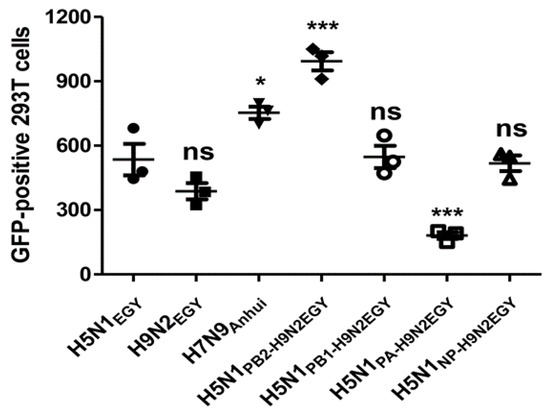 3.3. Impact of the Polymerase Subunits of H9N2EGY on the Polymerase Activity of Reassortant H5N1EGY