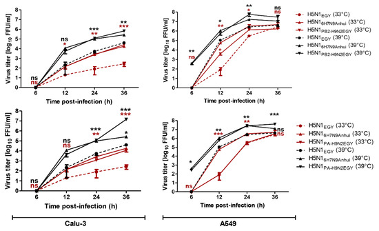 Replication kinetics of H5N1EGY reassortants in mammalian cell culture models. Calu-3 and A549 cells were infected (in triplicates) with the H5N1EGY reassortants or wild-type H5N1EGY and control H5N16H7N9Anhui at multiplicities of infection (MOIs) of 0.001 and incubated at 33 °C or 39 °C. At 6, 12, 24, 36 h p.i., the cell culture supernatants were collected and the virus titre was determined. Statistical analysis was performed using two-way ANOVA, followed by Bonferroni post hoc test. The significant differences are indicated (* = p < 0.05, ** = p < 0.01, *** = p < 0.001 and non-significant = ns).
