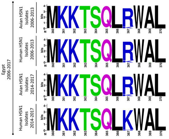 Prevalence of lysine and argenine at amino acid (aa) residue 367 among Egyptian human and avian H5N1 isolates (2006 to 2017). The graphic was created via Web-based WebLogo application (http://weblogo.threeplusone.com/create.cgi) [29]. The aa color is given according to their chemical properties. Polar aa “T and S”: green; neutral aa “Q”: purple; basic aa “K and R”: blue; hydrophobic aa “M, L, W, A and L”: black.