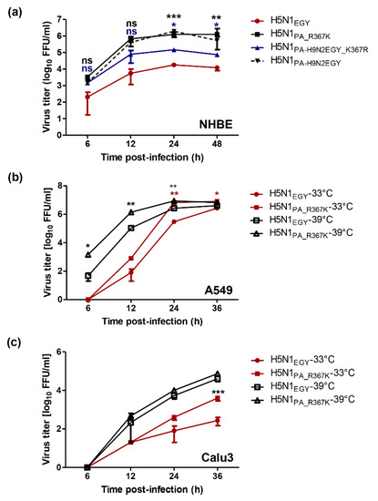 Based on the fact that the initial infection and onward transmission of an influenza virus depends on efficient virus replication in the human respiratory tract, we tested the replication of the mutant H5N1PA_R367K versus the wild-type H5N1EGY in A549 (Figure 7b) and Calu-3 (Figure 7c) at two different temperature settings, 33 °C and 39 °C, representing the initial site of infection and the subsequent alveolar infection, respectively. Interestingly, H5N1PA_R367K showed significant higher replication than the wild-type H5N1EGY in A549 cells at 12–24 h p.i. at 39 °C and 24–36 h p.i. at 33 °C (Figure 7b). In Calu-3 cells, comparable replication kinetics were observed for H5N1PA_R367K and H5N1EGY at 39 °C. However, H5N1PA_R367K showed significant higher replication than the wild-type at 36 h p.i. at 33 °C (Figure 7c). This indicates a possible improvement of the viral fitness of H5N1PA_R367K at the initial site of infection.
