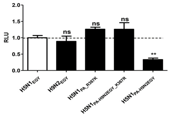 PA-367K does not significantly alter the in vitro polymerase activity of H5N1EGY in human 293T cells. The 293T cells were transfected with plasmids expressing the three subunits (PB2, PB1, PA) of the viral RNA-dependent RNA polymerase (RdRp) and the viral nucleoprotein (NP) of H5N1EGY or H9N2EGY (controls) or combinations of H5N1EGY PB2, PB1 and NP with mutated PA of H5N1EGY (PA_R367K) or of H9N2EGY (PA-H9N2EGY_K367R), as well as wild-type PA of H9N2EGY (PA-H9N2EGY). Along with the three RdRp subunits and NP expressing plasmids, a Renilla luciferase expression plasmid (transfection control) and a vector expressing a vRNA-like Pol-1 transcript encoding the firefly luciferase was co-transfected. At 48 h p.t., the control and transfected cells were analyzed for Renilla/luciferase expression levels. The significance was tested using one-way analysis of variance ANOVA, followed by Dunnett’s multiple comparison post hoc test and the significant differences are indicated (** = p < 0.01 and non-significant = ns).