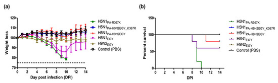 Pathogenicity of wild-type H5N1EGY, H9N2EGY, reassortants H5N1PB2-H9N2EGY and H5N1PA-H9N2EGY, mutants H5N1PA_R367K and H5N1PA-H9N2EGY_K367R in female BALB/c mice. Mice were infected with 103 PFU of each virus in 30 μL PBS. (a) The body-weight reduction rate and the mortality rate as demonstrated by weight loss (a) and the survival rate (b), respectively, were monitored for 14 dpi. Mice judged moribund (body weight loss > 25%) were euthanized.