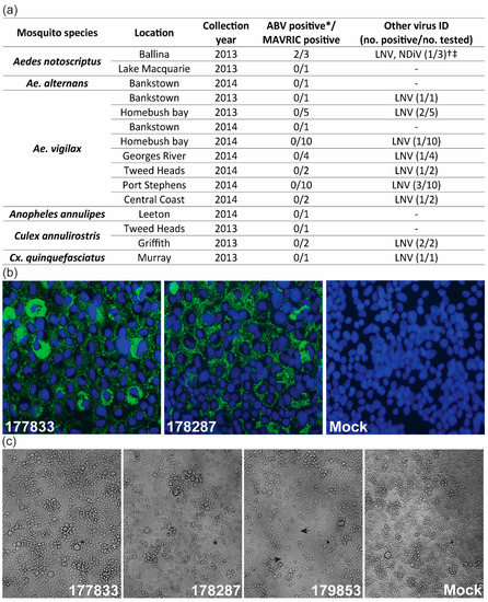 Isolation and prevalence of Aedes birnavirus (ABV). (a) Summary of screening for ABV and known insect-specific viruses (ISVs) in MAVRIC-positive mosquito pools collected in NSW between 2013 and 2014. (b) Anti-double-stranded RNA (dsRNA) immunolabeling in C6/36 cells inoculated with mosquito pools 177833 and 178287, or mock infected (media only) in immunofluorescence assay. Images were taken at 63× magnification. Green: dsRNA. Blue: nuclei. (c) C6/36 cells infected with ABV isolates 177833 and 178287, NDiV/LNV co-infected isolate 179853 and mock-infected cells. Gaps in the monolayer typical of NDiV/LNV infection are depicted by arrows for isolate 179853. Cell monolayer images were taken at 20x magnification. * Screened by RT-PCR with ABV-specific primers. The † LNV/NDiV-positive pool did not contain ABV. ‡ Ballina LNV/NDiV isolate originally reported in Prow et al. [28].