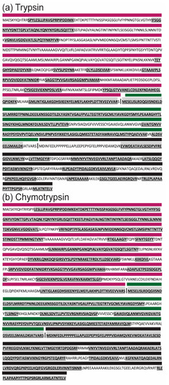 - Giansanti, P.; Tsiatsiani, L.; Low, T.Y.; Heck, A.J.R. Six alternative proteases for mass spectrometry–based proteomics beyond trypsin. Nat. Protoc. 2016, 11, 993–1006. [Google Scholar] [CrossRef]