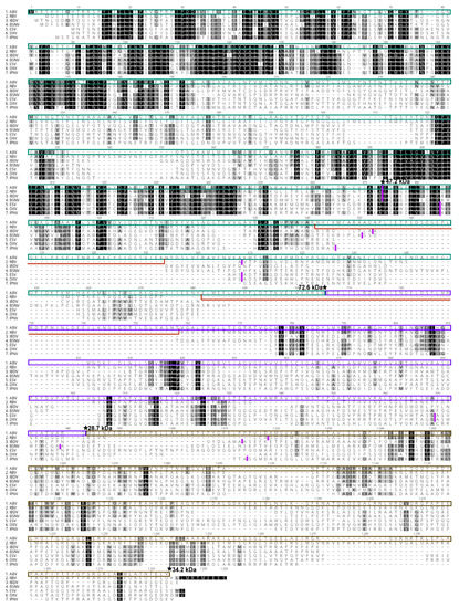 Clustal W alignment of amino acid polyprotein sequences for ABV, RBV (CAX33877), IBDV (ANY27027), BSNV (CAD30689), ESV (AEW87521), DXV (NP_690836) and IPNV (NP_047196). Non-conserved insertions of 61 and 85 amino acids in the ABV polyprotein are indicated by red lines. Vertical lines in magenta depict published polyprotein cleavage sites for these birnaviruses [41,42]. ★ Denotes predicted cleavage sites for ABV based on mass spectrometry data; Molecular weights predicted using ExPASy compute pI/MW tool are marked at the c-terminus of each resulting protein. Green box, pVP2. Purple box, VP4; brown box, VP3.