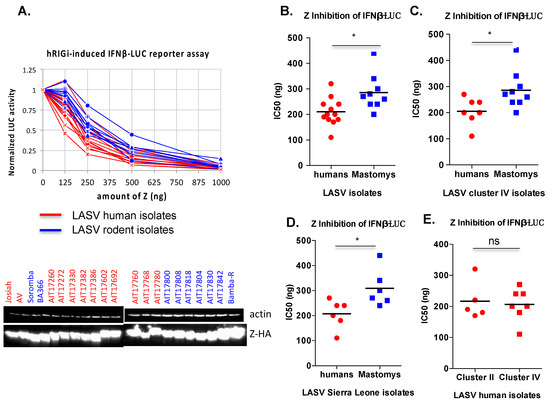 Comparative hRIG-I inhibitory analysis of Z proteins from different LASV isolates. The hRIG-I inhibitory effects by the respective Z proteins (in a dose-dependent manner) were determined as described above in the Figure 2 legend. (A) The normalized LUC activity by the empty vector control is shown for each Z protein in different doses. Western blot analysis of the tested LASV Z proteins is shown, with those from human viral isolates in red and those from rodent viral isolates in blue. Notable differences in the size of the Z proteins correspond to differences in their primary amino acid sequences. IC50 values were determined by the amount of the Z plasmid required to reduce the LUC reporter activity by 50% and are compared between Z proteins of human and rodent viral isolates (B), between Z proteins of human and rodent viral isolates within the same cluster IV (C), between Z proteins of human and rodent viral isolates within the same country (Sierra Leone) (D), and between Z proteins of human viral isolates between clusters II and IV (E). Each plasmid transfection experiment was conducted in triplicate and repeated in at least two independent experiments. Statistical significance between two groups was determined using the two-tail unpaired Student’s t-test of GraphPad Prism 6 software. Statistical significance: ns, not significant; *, p < 0.05.
