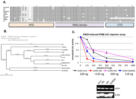 The full-length amino acid sequences of Z proteins from diverse LASV isolates and LCMV strains were obtained from the GenBank database and were analyzed via multiple protein alignment and phylogenetic tree using the MacVector Software (MacVector, Inc., Apex, NC, USA).