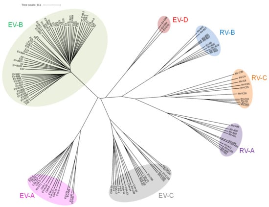 Evolutionary relationship of human enterovirus species. Molecular phylogenetic analysis of human enteroviruses was inferred using the Neighbor-Joining method (Letunic and Bork, 2019). Phylogenetic tree was constructed using complete sequence of enteroviruses aligned by muscle method. The optimal tree with the sum of branch length = 18.13314604 is shown. The tree is drawn to scale, with branch lengths in the same units as those of the evolutionary distances used to infer the phylogenetic tree. The evolutionary distances were computed using the Kimura 2-parameter method and are in the units of the number of base substitutions per site. This analysis involved 128 nucleotide sequences. All ambiguous positions were removed for each sequence pair (pairwise deletion option). There was a total of 8522 positions in the final dataset. Evolutionary analyses were conducted in MEGA X (Kumar et al., 2018). EV-A: Enterovirus A; EV-B: Enterovirus B; EV-C: Enterovirus C; EV-D: Enterovirus D; RV-A: Rhinovirus A; RV-B: Rhinovirus B; RV-C: Rhinovirus C.