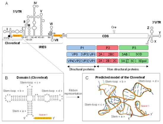 EV-B replication activities are dependent on the 5′ NCR of about 750 nt in length divided into two highly conserved and well-known structured functional regions. The first one is a ≈90 nt predicted Cloverleaf-like secondary structure also known as stem-loop-I (SL-I) or domain-I, which is crucial for the initiation of the genomic replication for both viral positive- and negative-strands RNA. Enteroviral RNA domain-I presents a conserved structural pattern among EV-B organized in one stem “a” and three stem-loops “b”, “c”, and “d” and commonly named Cloverleaf-like structure or RNA domain-I (Figure 2B,C). The second two-dimensional structured pattern from the 5′ NCR is composed of six stem-loops (SL II–VII) and is an IRES involved in the cap-independent viral polyprotein translation (Figure 2A) [,,,], the host range [], the replication efficiency [,], the cell tropism, and the virulence [,,]. Two regions of around 40 and 100 nt space, respectively, the Cloverleaf from IRES and then the IRES from the translation initiation codon into the VP4 coding sequence [] (Figure 2A). Enteroviral genome has a principal ORF encoding a long and single monocistronic autocatalytic polyprotein of ≈250 kDa resulting in viral capsid proteins and non-structural proteins. Moreover, a second upstream ORF (uORF) of the principal has been recently identified and could encode for a protein promoting the viral growth in initial viral replication sites (human epithelial cells) and facilitating viral particle release [,]. These two ORFs are flanked by 5′ and 3′ NCRs, also called untranslated regions (UTR). The genomic RNA of picornaviruses is linked to a viral protein genome-linked (VPg) at its 5′ NCR, which acts as a primer during viral RNA synthesis [,,,]