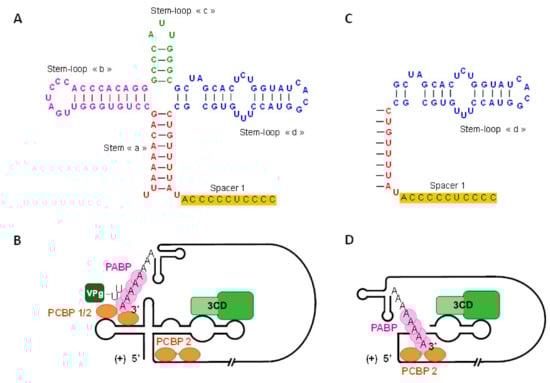 Interestingly, experimental genetic restoration of the partially deleted Cloverleaf-like secondary structure of described 5′ TD viruses allowed the re-establishment of the viral replication and cellular pathogenesis evidenced through the induction of cytopathic effect on cultured cells []. Disrupting PCBP2 binding to either stem-loop “b” or the C-rich sequence inhibits enteroviral RNA replication identifying PCBP2 cell host protein as one of the main cofactors during viral RNA replication [,,] (Figure 4B,D). Within replication complexes, the presence of at least one PCBP binding site in the 5′ NCR (i.e., stem–loop “b” or C-rich sequence) appeared to be sufficient to support efficient negative-strand synthesis [,].