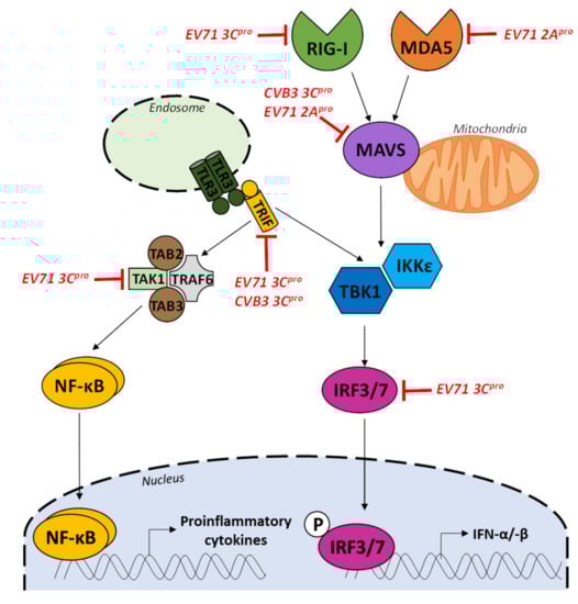 A reported strategy developed by EV-B to overcome antiviral immune response is to cleave or partially disrupt RLRs MDA5 receptor during EV-B infection by viral proteases activities, therefore impairing the innate immune sensing of viral RNA double-strand forms [,,,,] (Figure 5). For poliovirus, CV-B3, and EV-71, the 2Apro activity results in the disruption of MDA5 structures, even though some authors discuss that such MDA5 or mitochondrial antiviral signaling protein (MAVS) cleavage may take place in a proteasome-dependent or activated caspase-3 pathway [,,]. To transfer the signal downstream in the type I IFN signaling pathway, ligand-bound MDA5 (CARD) links to the adaptor molecule MAVS at the mitochondrial membrane (Figure 5). In a similar way, the 3Cpro of EV-B can cleave various intermediate protein factors of the type I IFN pathway [] including RIG-I receptor (Figure 5) [,]. Indeed, 3Cpro activity can mediate the cleavage of key molecules such as transforming growth factor-β activated kinase 1 (TAK1)/TGF-β Activated Kinase 1 (TAB1)/TAB2/TAB3 complex which are known to activate the Nuclear factor kappa B pathway inducing a pro-inflammatory cytokine expression [] (Figure 5). Moreover, EV-71 3Cpro activity was described as capable to cleave Interferon Regulatory Factor 7 (IRF-7) inhibiting its ability to transactivate IFN-β expression by its phosphorylated form during early phase of viral infection [] (Figure 5).