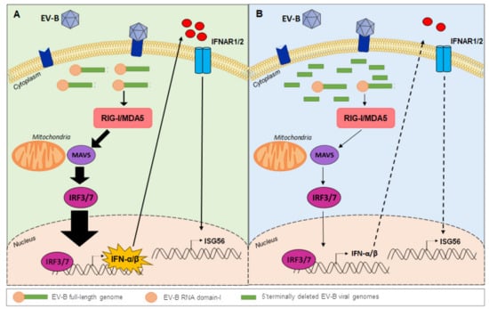 Natural 5′ terminally deleted group-B enterovirus RNA forms can modulate type I interferon signaling pathway activation. (A) Full-length viral RNA is recognized by cytoplasmic sensors RIG-I or MDA5 in EV-B infections. Signaling through the adaptor protein MAVS leads to IRF3 activation and translocation to the nucleus. These molecules stimulate high level of IFN-α/β and ISG56 production for the development of effective antiviral responses to EV-B infections. (B) According to recent reports, deleted viral genomes were associated with parental complete virus in early phase group-B enterovirus infection. Host cell proteins recruited in viral RNP complexes or potentially acting as a restriction factors could provide an evolutionary advantage to the 5′ NCR truncated viral RNA forms. Deletion in RNA domain-I (5′ terminally deleted viral genomes) could impair the viral genomic RNA recognition by RLRs (RIG-I or MDA5) immune sensors during the early phase of antiviral innate immune response resulting in low level of IFN-α/β and ISG56 production. IFN: interferon; RIG-I: retinoic acid-inducible gene-I; MDA5: melanoma differentiation-associated protein 5; MAVS: mitochondria antiviral-signaling protein; IRF: Interferon Regulatory Factor 3; ISG56: interferon stimulated gene 56; 5′ NCR: 5′ non-coding region.