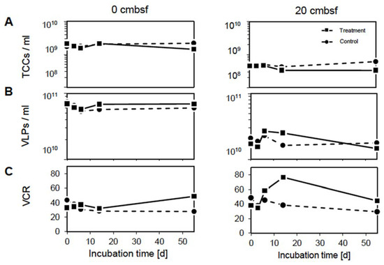 Changes in (A) prokaryotic and (B) virus abundances as well as (C) virus-to-cell ratio dynamics over the course of the experiment in the 0 cmbsf (left column) and 20 cmbsf incubations (right column). The mitomycin C treated incubations are displayed by the solid line and squares, the non-treated controls by the dashed line and circles.