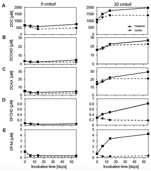 The observed discrepancy in organic carbon compound concentrations between the control and treatment of the 20 cmbsf incubations could be a result of different community compositions in the treatment and control. The control showed a community shift to more copiotrophic Gammaproteobacteria and Flavobacteria, which are known to be better adapted to high substrate concentrations [69]. This might partially explain the better exploitation of organic compounds in the controls compared to the treatment.
