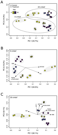 Principal coordinate analysis based on Bray-Curtis dissimilarities of relative peak intensities. Calculated for (A) the samples of both depths, (B) samples from the 0 cmbsf and (C) 20 cmbsf incubations, color-coded by the main sampling time points (day 0, 6, 14, and 55). The explained variance for the data set is given for the first two major axes of variation. Associated analytical replicates are marked by the gray background. Mitomycin C treated samples are displayed by squares and non-treated controls by circles. Molecular DOM parameters (black arrows) are fitted to the ordination.