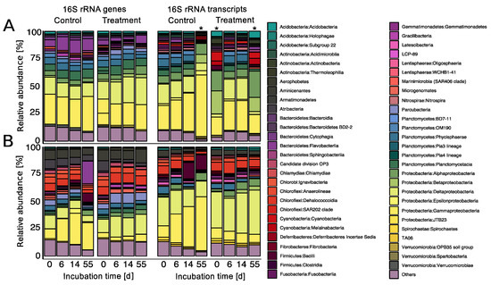 Changes in the total and potentially active bacterial communities during the experiment were assessed by Illumina sequencing of 16S rRNA amplicons, generated from 16S rRNA genes and transcripts as described previously [31]. Briefly, DNA was extracted from 0.5 mL slurry using the DNeasy PowerSoil kit (Qiagen, Hilden, Germany) according to the manufacturer’s instructions. RNA extractions of 0.5 mL slurry were performed by the Allprep DNA/RNA Mini Kit (Qiagen) following the provided instructions with modifications as described by Pohlner et al. [31]. The concentration and purity of the nucleic acid extracts were evaluated spectrophotometrically (NanoDrop 2000c, Thermo Fisher Scientific, Waltham, MA, USA) and stored at −20 °C until further analysis.