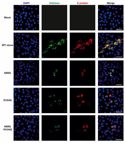 Confirmation of the inserted-marker (ZsGreen) and ZIKV E protein expression from rescued ZIKV variants. Vero B4 cells were grown on eight-well chamber slides. At 50% confluence, the cells were transfected with in vitro transcribed ZIKV RNA. At 72 hpt, the cells were fixed and stained with rabbit anti-ZIKV E antibody, anti-rabbit conjugated to Alexa Fluor 568 and DAPI. The samples were analyzed using a Nikon A1R+ confocal microscope and ImageJ software. Scale bar = 50 µm. DAPI = 4′,6-diamidino-2-phenylindole; ZsGreen = green fluorescent protein derived from Zoanthus sp.; E protein = envelope protein; WT clone = wild-type ZIKV with the ZsGreen reporter gene; N69Q = ZIKV with a mutated N-glycosylation site in prM; N154Q = ZIKV with a mutated N-glycosylation site in E; N69Q/N154Q = ZIKV with mutated N-glycosylation sites in prM and E.