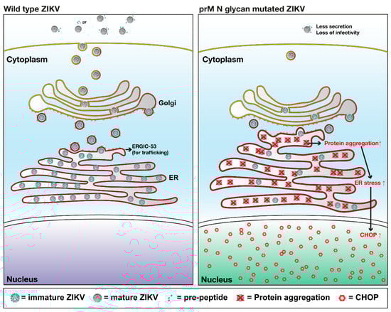 Hypothetical model of the role of N-glycosylation of the prM protein in ZIKV. Mutation in the prM N-glycosylation site caused accumulation of virus proteins in ER, which induced increased ER stress in the cell. Eventually, the up-regulated ER stress triggered the expression of CHOP and its translocation into nucleus. ZIKV = Zika virus; Golgi = golgi apparatus; ER = endoplasmic reticulum; ERGIC-53 = ER-Golgi intermediate compartment 53 kDa protein or lectin mannose-binding 1; prM = pre-membrane protein; CHOP = C/EBP Homologous Protein.